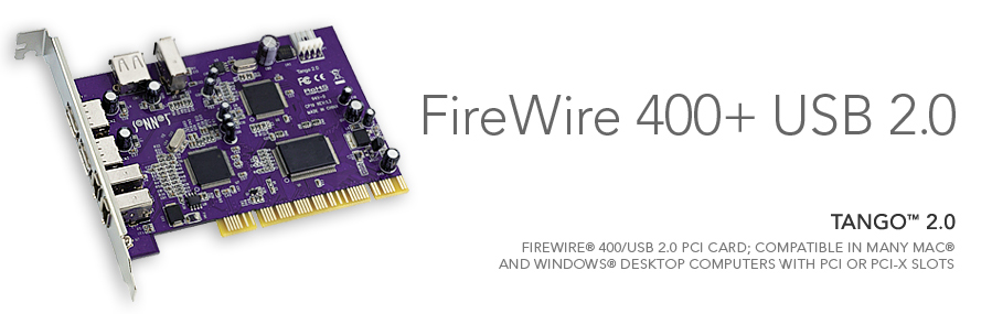 Sonnet's Tango 2.0 adds three (two external plus 1 internal) USB 2.0 and three (two external plus 1 internal) FireWire 400 ports to your computer. This adapter card installs easily into one of your computer’s PCI slots, features hot-pluggable and hot-swappable device connection support with automatic device configuration, and works with all industry-standard USB 2.0 and FireWire 400 peripherals.